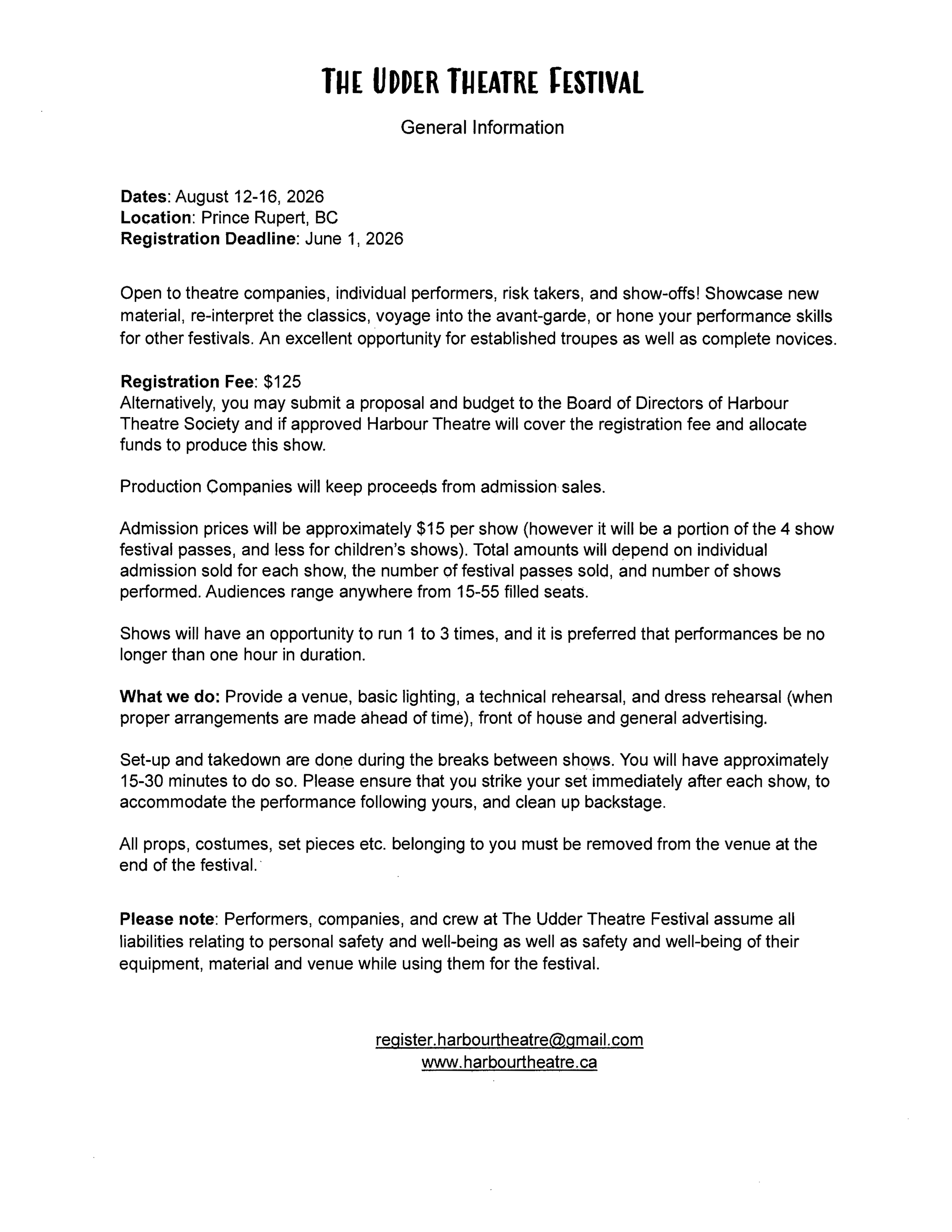Prince Rupert’s only live theatre festival! If you would like to submit a 45 minute show, please fill out the form below, or email us at harbourtheatre@gmail.com for more details. Block out your calendar from August 12 - 16 because It’s going to be udderly FANTASTIC! Check back for the full festival program and poster!